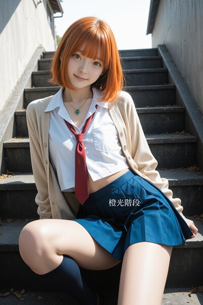 【放課後の踊り場、夕映えに染まる青春。】窓から差し込む鮮やかな「オレンジ」の夕光が、「階段」を美しく照らし出します。そこには、軽やかな「ショートカット」を揺らしながら歩む、瑞々しい「制服」姿の彼女。階段を一段登るたびに、翻る「ミニスカート」から覗く脚のラインが、夕闇に溶け出す前の刹那の輝きを放ちます。日常の何気ない風景が、光と影のコントラストでドラマチックに昇華される「橙光階段」。ノスタルジックな…