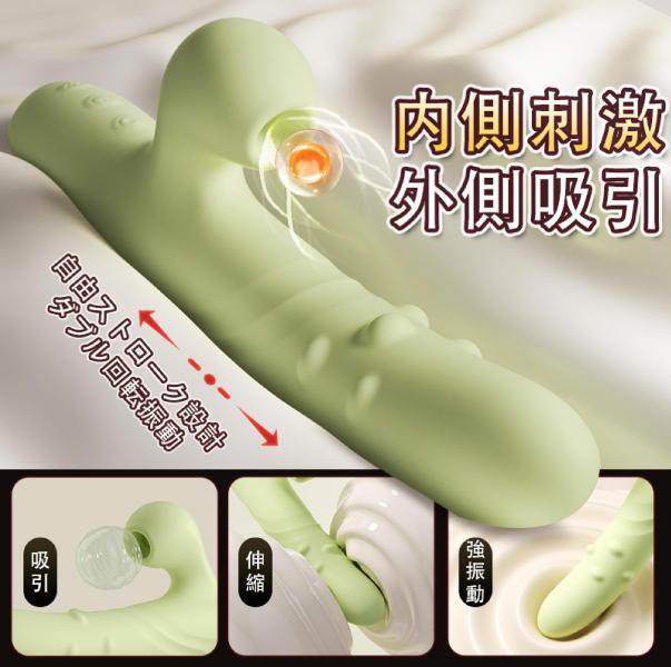 本製品は、吸引・伸縮・回転・振動の4つの機能を融合した多機能電動バイブです。