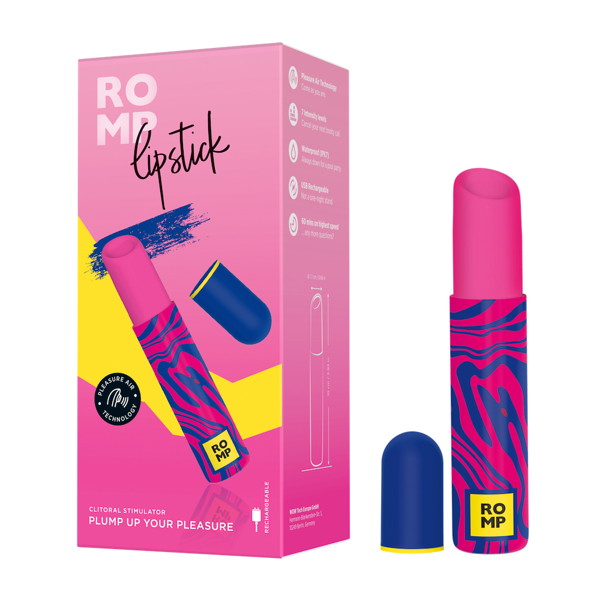 ROMPLipstickは、直径19mm,長さ105mmの最小クラスのコンパクトさと、持っているだけで楽しくなるようなカラフルデザインのリップ型の吸引バイブ。